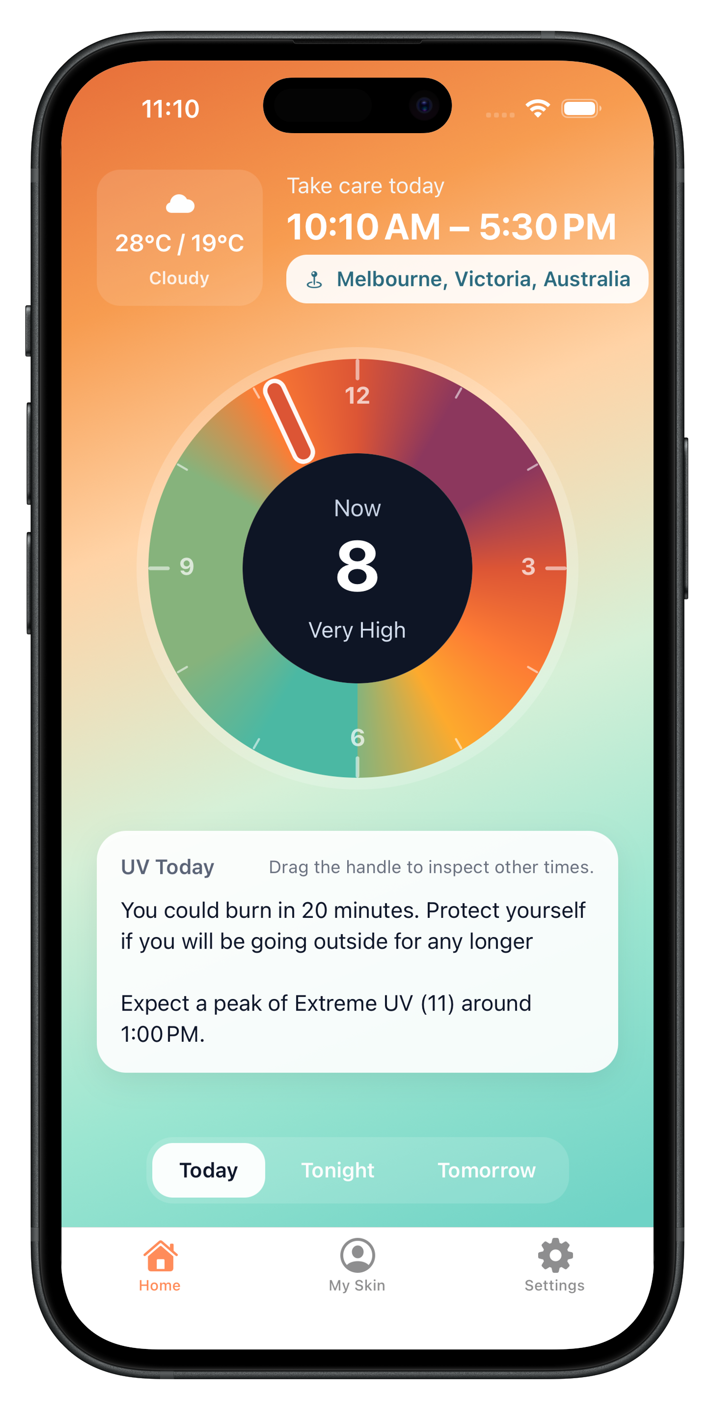 Your UV forecast for the day, see when it’s safe to be outside and when to avoid the sun.